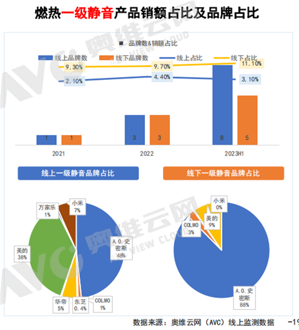 靜音同樣是主要趨勢之一。燃熱一級靜音的入局品牌顯著增多。一級靜音產品線上同比增加3.10%,線上品牌數同比增加11.1%,A.O.史密斯在靜音領域可謂是一家獨大,線上占比近五成,線下占比近九成。