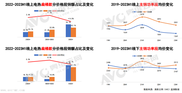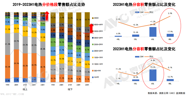價格段方面,線上市場2000-2499元價格段和3500元以上價格段呈現增長趨勢;線下市場4000元以上價格增長顯著,其中,6000元以上價格段零售額占比達到19.1%。線上16L和18L均價同比增長5.2%和11.3%,助推價格提升。