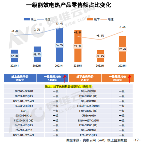 隨著“綠色低碳,節能環保”的理念深入人心,能效也成為消費者選購的重要因素之一。據奧維云網(AVC)數據顯示,電熱、燃熱一級能效占比均有所增長,一級能效電熱產品線上零售額占比66.5%,同步提升13.4%,均價提升至1483元,線下零售額占比72.4%,同步提升6.6%,均價提升至2540元。