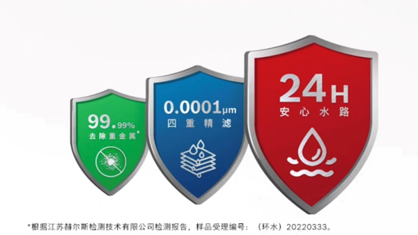 博世嵌入式凈飲機全水路采用抗菌材質,能有效抑制細菌滋生,可有效避免自來水在凈化過程中被二次污染,“安心水路”的第1重盾護為全家飲水健康提供了24小時長效護航,讓每一滴水更潔凈安心。而為快速將自來水凈化為可以直接飲用的純凈水,產品搭載了原裝杜邦反滲透濾芯,搭配多合一復合濾芯,可憑借第2重盾護“四重精濾”,將水中重金屬、細菌等有害物質去除,凈化效果可達0.0001微米1;同時在四重精濾之一的活性炭棒支持下,還能進一步改善水的口感。第3重盾護“去除重金屬”則憑借雙濾芯相互配合,可實現99.99%2的重金屬、揮發性有機物的去除率,為居家飲水提供更健康安全的解決方案。