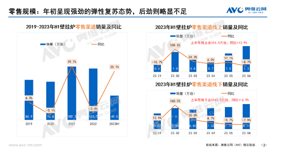 奧維云網(wǎng)也在市場(chǎng)總結(jié)中表示,零售渠道已成為壁掛爐行業(yè)重要的驅(qū)動(dòng)力。分季度來(lái)看,零售回暖主要在1-4月,同比呈雙位數(shù)增長(zhǎng);5-6月開(kāi)始出現(xiàn)小幅下滑。