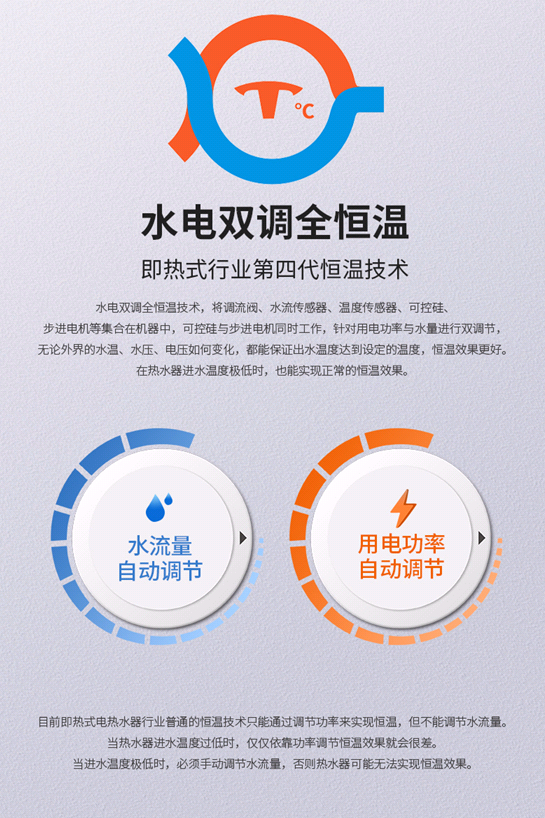 水電雙調全恒溫技術,可以同時自動調節用電功率與水流量,無論外界的水溫、水壓、電壓如何變化,都能保證出水溫度達到設定的溫度,恒溫效果更好,水量與水溫也更精準。