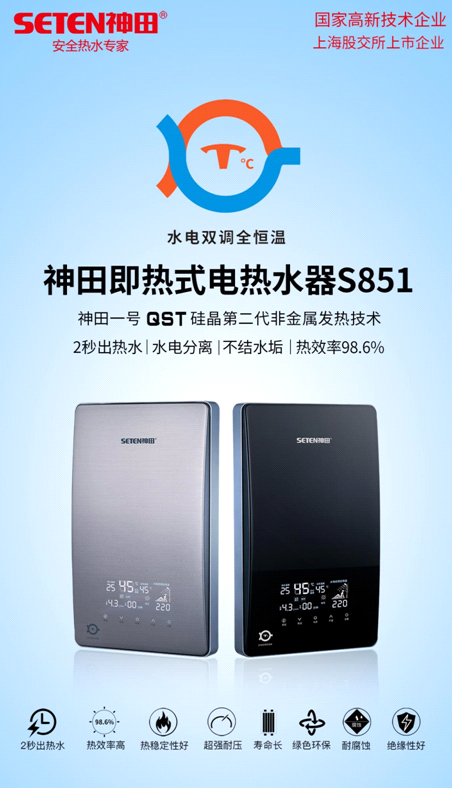 水電雙調全恒溫S851采用神田一號QST硅晶雙芯雙核6核非金屬加熱技術,水電分離,不結水垢,2秒出熱水,熱效率約98.6%;水電雙調全恒溫控制系統,恒溫效果更好;超跑車的溜背式設計,盡顯運動線條之美;超大寬屏LED熒光白屏,清晰明亮;觸摸感應按鍵,操作靈敏;微電腦控制,防漏電,防超溫、防超壓、防干燒、故障自檢、防脈沖干擾、防雷擊等多重安全保護。