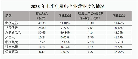 在2023年的半年報中我們可以看到,廚電巨擘老板電器營業收入與凈利潤雙雙增長,分別為11.04%和14.67%,增幅均達到了兩位數;華帝股份營業收入增幅2.72%,凈利潤大漲8.12%。