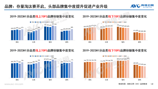 而TOP3和4呢,其生存空間也在被壓縮——2019年和2023年線上煙機TOP3和4份額占比均為17%,灶具則從21%被壓縮到18%;2019年線下煙機TOP4和5份額占比12%,2023年則為9%,灶具從11%下滑到9%。