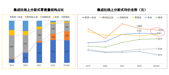 在提升單價方面,集成灶迅速跨過之前廚電行業踩過的深坑——以價換量,采用優化產品結構的方式提高單價,實現營業收入的增加。根據奧維云網數據2023年上半年線上分款式零售量結構占比,唯一獲得正向增長的是蒸烤獨立款集成灶,從2022年的占比15%增加到了21%,而這是所有款式中均價最高的一款。相對2022年均價10889元,2023年上半年均價10516元。