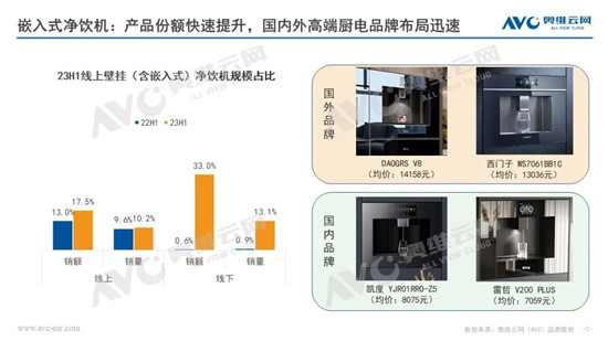 近幾年,在廚房場景中,嵌入式產品層出不窮,嵌入式冰箱、嵌入式洗碗機、嵌入式蒸烤箱高速發(fā)展,嵌入式凈飲水產品應運而生。奧維云網(AVC)監(jiān)測數據顯示,線上壁掛式凈飲機(含嵌入式)銷額、銷量份額同比增加4.5%、0.6%,線下壁掛式凈飲機(含嵌入式)銷額、銷量份額同比增加32.4%、12.1%。
