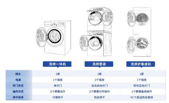 而洗烘集成機就是為了解決上面兩者的痛點,簡單來說,一體化設計之后,整體顏值高了,占地空間少了,但是功能各方面一點也沒少。