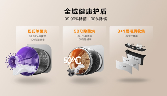 除了洗、烘、護之類,TCL雙子艙T10在“健康”方面也是出類拔萃,配置了巴氏除菌洗、50℃高溫除菌烘、3+1層毛屑收集等眾多健康功能,達到99.9%除菌率、100%除螨率和99%攔截率。