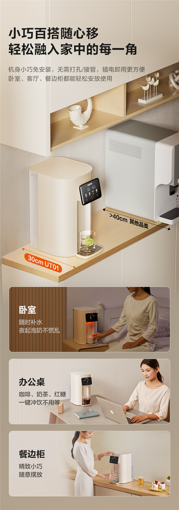 喝茶講究的心境,可以在書房看書喝,也可以在臥室的飄窗上喝,還可以在客廳和朋友們暢談時喝。想要隨時喝上干凈放心的純凈水,不如備一臺蘇泊爾凈飲機UT01,隨取隨用。蘇泊爾凈飲機UT01整體體積小巧,不需要安裝、用起來方便、不占地兒,相比起身長40cm以上的同品類產(chǎn)品,蘇泊爾凈飲機UT01僅30cm的身長更勝一籌,如同一個小巧的抱枕一樣精致,放在任何一個需要喝水、用水方便的位置都OK。