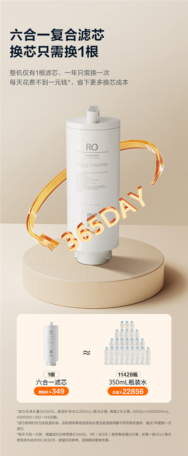 “凈水效果極佳,濾芯更換成本更高吧……”喝水多的年輕人難免關(guān)注耗材成本。在濾芯損耗方面,蘇泊爾也做到了最省——整機僅有1根六合一復(fù)合濾芯,一年只需更換一次,換芯成本按年折算下來,不超過1元/天。蘇泊爾凈飲機UT01有著一般飲水機更多元化的使用場景,相對于桶裝水與瓶裝水更安全,也能省去一筆不小的開支。
