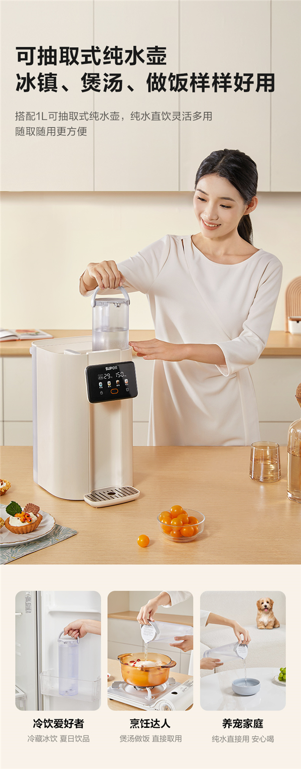 生活不僅有詩和遠方,還有當下的生活瑣碎。蘇泊爾凈飲機UT01將凈水、直飲、生活用水三合一,一機滿足直飲、煲湯、洗蔬果等多樣用水需求。內(nèi)置1L可抽取式純水壺,拿取輕松方便,可以提前備水,烹飪時隨取隨用,節(jié)省時間,清洗便捷,也可以直接用水壺裝好放進冰箱,也能實現(xiàn)果茶冷飲暢飲。蘇泊爾凈飲機UT01將凈飲機從單純的飲水機拓展成了全功能凈水器,實現(xiàn)凈水自由。