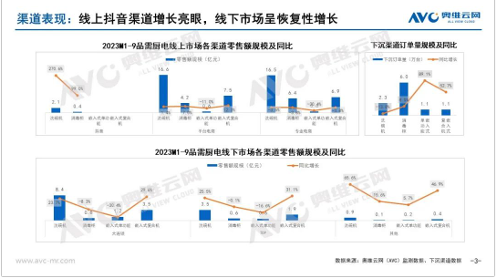 Z世代作為品需廚電目前的消費(fèi)主力,更加偏好線上購物,線上消費(fèi)持續(xù)升溫,其中抖音等興趣電商增長亮眼。根據(jù)奧維云網(wǎng)(AVC)監(jiān)測數(shù)據(jù),2023年1-9月洗碗機(jī)、消毒柜抖音渠道零售額分別同比增長270.6%、99.0%。線下渠道則由于疫情放開,門店快速復(fù)蘇,增長明顯,預(yù)計(jì)Q4線下將延續(xù)高增長態(tài)勢。