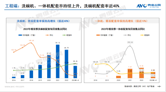 近年來,以洗碗機(jī)、一體機(jī)為代表的品需廚電配置率保持上升趨勢,根據(jù)奧維云網(wǎng)(AVC)地產(chǎn)大數(shù)據(jù)顯示,2023年1-8月洗碗機(jī)、一體機(jī)的配套率分別達(dá)到38.4%和9.6%,較2022年全年分別提升7.0個百分點(diǎn)、3.9個百分點(diǎn)。近年來居民對家電的升級需求旺盛,而洗碗機(jī)、一體機(jī)作為改善型廚電,品質(zhì)化標(biāo)簽明顯,溢價能力強(qiáng),預(yù)計(jì)洗碗機(jī)、一體機(jī)工程市場仍將持續(xù)向好。