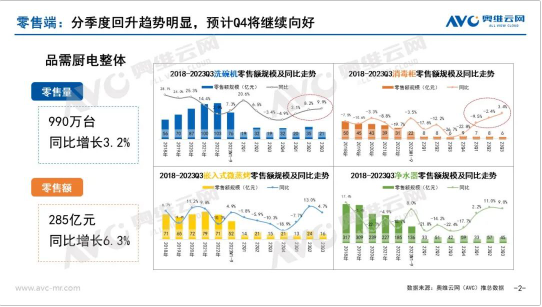 2023年Q3廚衛(wèi)品需品類(洗碗機(jī)、消毒柜、嵌入式微蒸烤、凈水器)整體延續(xù)了平穩(wěn)增長的態(tài)勢。據(jù)奧維云網(wǎng)(AVC)推總數(shù)據(jù)顯示,品需廚電前三季度累計(jì)零售額為285億元,同比增長6.3%;分季度來看,品需廚電Q1至Q3同比增速分別為-0.7%、9.6%、8.0%,看好Q4的增長。分品類看,洗碗機(jī)、消毒柜Q1至Q3逐季度上漲趨勢明顯,嵌入式微蒸烤、凈水器Q2高增長,Q3增幅放緩,整體增長強(qiáng)勁。