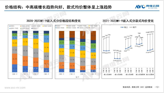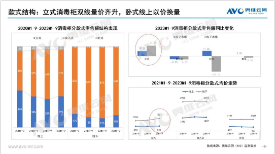 從款式結(jié)構(gòu)上看,嵌入式仍為主流款式,但立式消毒柜的份額正逐漸擴(kuò)張,增勢迅猛。根據(jù)奧維云網(wǎng)(AVC)監(jiān)測數(shù)據(jù),2023年1-9月立式消毒柜線上、線下零售額分別同比增長為10.2%、21.4%。立式消毒柜呈雙線增長勢頭,而伴隨著這一趨勢,其價格也逐漸攀升,可見企業(yè)對高端立式消毒柜市場的布局已經(jīng)開始。
