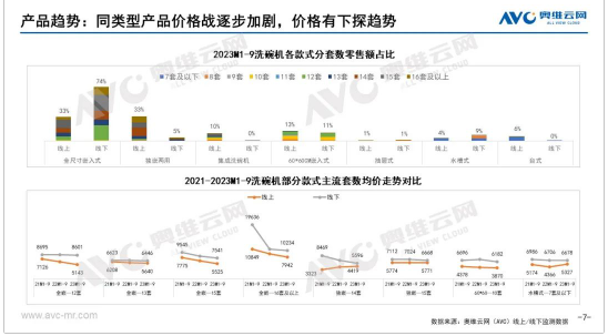 洗碗機(jī)部分同類型產(chǎn)品競爭激烈,價格開始下探,例如全尺寸嵌入式、獨(dú)嵌兩用等款式部分主流套數(shù)的產(chǎn)品均價均有一定程度下降。根據(jù)奧維云網(wǎng)(AVC)監(jiān)測數(shù)據(jù),2023年1-9月全尺寸嵌入式主流容量12套、13套、15套、16套及以上產(chǎn)品線上市場均價較上年同期分別下降15.9%、3.7%、15.3%、13.2%,線下市場均價較上年同期分別下降1.6%、3.1%、8.6%、5.0%;獨(dú)嵌兩用主流容量14套、15套產(chǎn)品線下市場均價較上年同期分別下降15.9%、5.1%。當(dāng)前,洗碗機(jī)仍處于滲透普及階段,同類型產(chǎn)品賣點(diǎn)和功能模塊差異化逐漸縮小,短期內(nèi)價格戰(zhàn)現(xiàn)象或仍將存在。