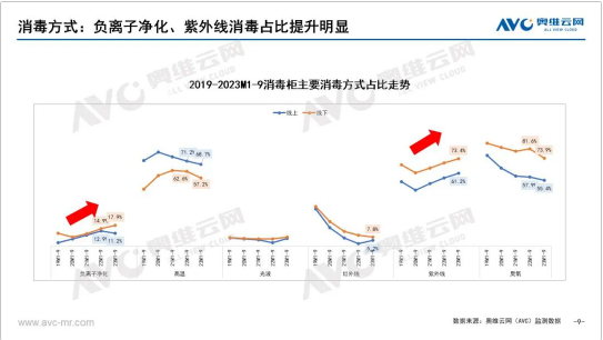 目前,消毒柜仍以高溫、紫外線、臭氧消毒為主,其中紫外線消毒的占比提升明顯。根據(jù)奧維云網(wǎng)(AVC)監(jiān)測數(shù)據(jù),2023年1-9月紫外線消毒線上、線下零售額占比分別為73.4%,61.2%,較上年同期分別提升3.9、3.7個百分點(diǎn)。此外,負(fù)離子凈化線上占比也有一定程度增長。