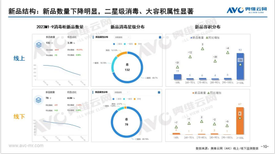 近年來,消毒柜新品數(shù)量持續(xù)下降。根據(jù)奧維云網(wǎng)(AVC)監(jiān)測數(shù)據(jù),2023年1-9月消毒柜線上新品數(shù)量132個,同比下降10.3%;線下新品數(shù)量78個,同比下降1.4%。新品消毒星級以二星級消毒為主,2023年1-9月新品二星級消毒占比線上、線下分別為69.7%、89.7%。新品容積主要集中在100L及以上,2023年1-9月新品容積≥100的數(shù)量分別為92個、67個,占比均在60%以上。