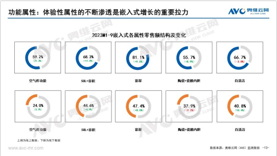 從功能屬性看,嵌入式微蒸烤作為品需廚電,體驗(yàn)性屬性的不斷改善與滲透是保持行業(yè)活力、促進(jìn)行業(yè)增長的必然路徑,也是消費(fèi)者的必然要求。根據(jù)奧維云網(wǎng)(AVC)監(jiān)測數(shù)據(jù),含有空氣炸功能產(chǎn)品、容積50L以上產(chǎn)品、彩屏產(chǎn)品的雙線零售額占比均有所提升,其中含空氣炸功能產(chǎn)品線上增長尤為明顯,2023年1-9月相較于同期零售額占比增加了21.3個百分點(diǎn)。除此以外差異化內(nèi)膽、腔體自清潔也成為消費(fèi)者越來越關(guān)注的產(chǎn)品賣點(diǎn)。戳→奧維數(shù)據(jù)羅盤