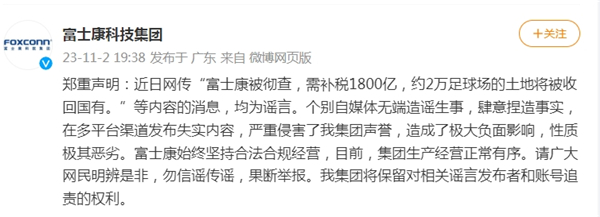 該聲明針對的是,富士康被傳出遭稅務部門稅務稽查的傳聞。該傳聞稱,稅務部門近期依法對富士康集團在廣東、江蘇等地的重點企業進行稅務稽查,自然資源部門對富士康在河南、湖北等地的重點企業用地情況進行現場調查。