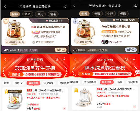 這一點市場已經給出了答案。截至11月3日14:00,天貓、京東平臺養生壺熱賣榜顯示,小熊電器養生壺成為用戶首選。具體來看,在天貓平臺,多款小熊電器養生壺位列熱賣榜前列,深受消費者喜愛,而在京東平臺,小熊電器養生壺不僅位居總榜前三,而且多個爆款單品分別位居玻璃燉盅、隔水燉煮、玻璃濾網等多個細分維度榜單第一。