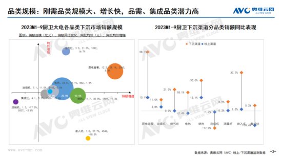 相較于剛需廚電,品需廚電在下沉市場(chǎng)的表現(xiàn)則稍遜一籌,品類的教育和滲透亟待加強(qiáng)。據(jù)奧維云網(wǎng)(AVC)下沉渠道監(jiān)測(cè)數(shù)據(jù)顯示,2023年1-9月,洗碗機(jī)、嵌入式、消毒柜銷額規(guī)模分別為1.3億元、1.0億元、1.0億元,同比增速分別為-17.0%、37.7%、8.9%;其中,洗碗機(jī)是廚衛(wèi)行業(yè)中唯一下降的品類。今年以來,國(guó)家和地方發(fā)布多項(xiàng)支持綠色智能家電下鄉(xiāng)的相關(guān)政策,在政策利好的背景下,企業(yè)應(yīng)抓住下沉用戶熟人經(jīng)濟(jì)和從眾心理的消費(fèi)特征,精準(zhǔn)施策,擴(kuò)大品牌影響力、提升消費(fèi)者品類認(rèn)知。