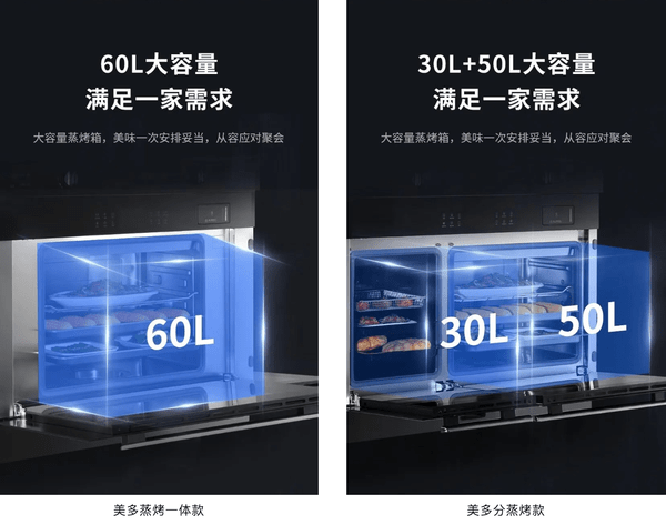 美多語音集成灶新品系列主要分為蒸烤一體集成灶和分蒸烤集成灶,可以根據不同家庭的烹飪個性化需求來選擇:其中,蒸烤一體款60L超大容量蒸烤箱內腔共有四層擱置架,一次可以烤制或者蒸制多道菜品,對于蒸、烤兩種烹飪方式其一比較鐘情的家庭可選擇,此款具有價格優勢同時還可滿足6-8人家庭或者親友聚會烹飪的大多數場景需求;分蒸烤款將蒸烤箱黃金比例分割,30L烤箱和50L蒸箱可以單獨運行使用也可以蒸和烤同步進行,滿足多樣化烹飪模式,滿足不同人的口味偏好。