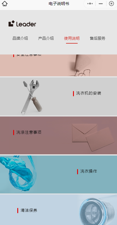 電子說明書分為四個版塊:品牌介紹、產品介紹、使用說明和售后服務;使用說明下面,又分為安全注意事項、洗衣機的安裝、洗滌注意事項、洗衣操作和清潔保養這5個版塊。在這5個板塊中,比較實用的是洗滌注意事項和洗衣操作這個兩個版塊。洗滌注意事項中,分為不可洗滌衣物、檢查衣物、衣物分類洗滌、重污衣物預處理,重污衣物放入法、衣物洗滌重量參考;洗衣操作下由分為洗衣步驟、操控界面、開機、程序、參數等5個小項目。