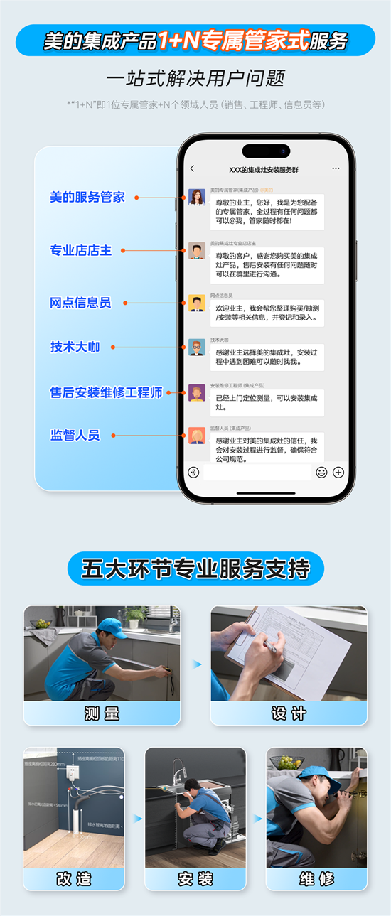 美的集成灶推出“1+N”專屬管家式服務,從勘察、購買到安裝,1V1專屬群對接,1位專屬管家+N個領域(銷售、工程師等)人員高效協同、24H響應服務、實時了解安裝進度、全流程可視;隨時解答售后疑問、快速溝通;提供高效協同、快速溝通、專業監理的一站式服務。