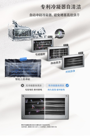 干衣機的清潔問題也是消費者的一大困擾:家庭衣物烘干需求大,烘干過程中易產生大量毛絮而導致冷凝器堵塞,影響后續烘干效率,需要定期清潔;但手動清洗費時費水,還容易因不合理的清潔方式損壞冷凝器,阻礙干衣機的正常運行。