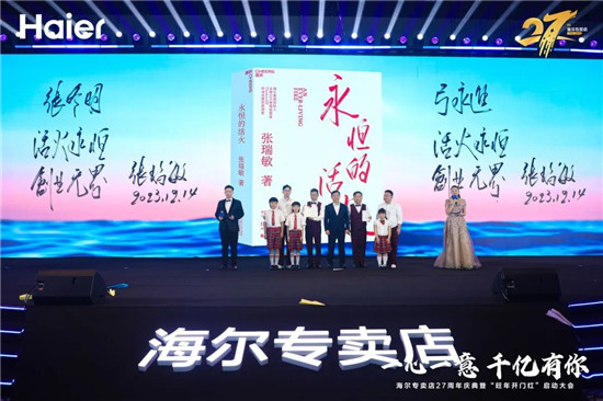 海一代、海二代、海三代同臺表演節目《奮斗者,正青春》。用真誠、正能量的演繹,展現了海爾專賣店是一份可以傳承的事業,也是一個有溫度的品牌。現場兩組專賣店客戶家庭代表,獲得張首席親筆題字的《永恒的活火》一書,由海爾智家領域主李總為其頒發。