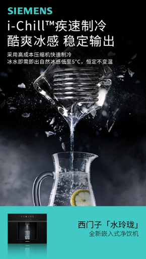 洞察到年輕消費者對冰飲的喜好,西門子「水玲瓏」嵌入式凈飲機還設置了i-ChillTM冰水技術打造“沁心冰爽”之感。與市面上普通凈水家電產品不同,這款新品采用壓縮機制冷,將制冷速度提高50%,實現冰水即需即出。同時,其制冷力度夠“勁”,每小時可制冷3升水,單次出冰水量高達1.5升,輔以智能循環系統有效解決“冰堵”難題,省去等待時長,用戶隨時隨心即可暢飲。在炎炎夏日,用戶只需輕觸屏幕,機體即出冰水,低至5℃呈現自然冰感、去熱解暑。