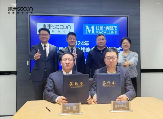 2024年1月11日,帥康電氣常務副總裁龐廷杰與紅星美凱龍智能電器總經理許晶在上海簽訂2024年戰略合作協議,雙方將在門店拓展、品牌傳播、聯合營銷、以舊換新、設計師運營等方面展開深度合作,共同推動廚電行業的創新發展。
