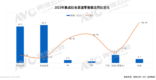 線上渠道方面,雖然近些年在傳統電商方面,集成灶增速明顯放緩,但是隨著抖音等社交電商的崛起,也帶動了集成灶品類的崛起。