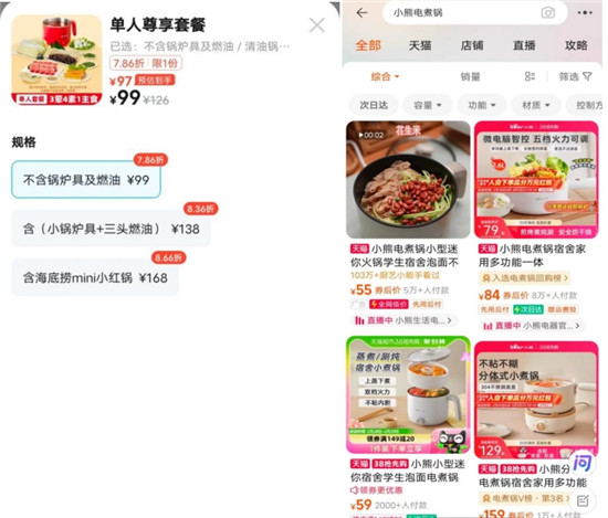 但是在海底撈的套餐中,小熊的電煮鍋套餐與無鍋套餐的差價(jià)為69元,同時(shí)我們在淘寶搜索“小熊電煮鍋”,首頁面產(chǎn)品中最低價(jià)僅為55元,并且為小熊官方店鋪。因而在這里,海底撈更像是小熊為其定制產(chǎn)品的一個(gè)銷售渠道,而不是合作。