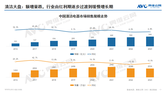 在2020年-2021年間,疫情需求紅利,疊加產(chǎn)品創(chuàng)新,清潔電器行業(yè)在兩年間實(shí)現(xiàn)了高增長(zhǎng)。但從2022年到2023年,清潔電器行業(yè)面對(duì)嚴(yán)峻經(jīng)濟(jì)環(huán)境、紅利逐步消退等諸多壓力,增長(zhǎng)逐漸出現(xiàn)了放緩的態(tài)勢(shì),奧維云網(wǎng)(AVC)推總數(shù)據(jù)顯示,2023年中國(guó)清潔電器零售額344億元,同比增長(zhǎng)6.8%,零售量2534萬臺(tái),同比下滑0.5%。