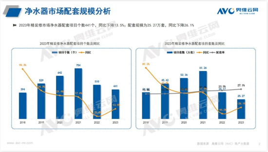 據(jù)奧維云網(wǎng)(AVC)監(jiān)測(cè)數(shù)據(jù)顯示:2023年精裝修市場(chǎng)凈水器配套項(xiàng)目個(gè)數(shù)441個(gè),同比下降13.5%;配套規(guī)模為25.27萬(wàn)套,同比下降26.1%,配置率達(dá)27.1%,同比上升3.6個(gè)百分點(diǎn)。凈水器作為舒適部品之一,規(guī)模走勢(shì)隨精裝大盤波動(dòng),從近五年精裝凈水器配套規(guī)模來看,配套規(guī)模從19年的45.42萬(wàn)套上升至21年最高61.26萬(wàn)套,之后近乎腰斬式下滑,23年降幅收窄18.1%,從近年配置率走勢(shì)來看,凈水器配置率始終保持趨緩上升趨勢(shì),配置率從2019年的13.9%持續(xù)上升至2023年27.1%。