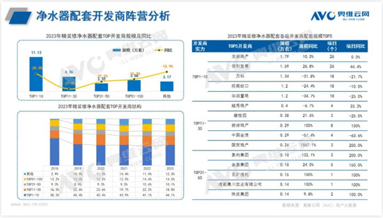 從開發(fā)商陣營(yíng)分析,2023年精裝修凈水器配套開發(fā)商中,前十開發(fā)商份額占比較大且呈現(xiàn)擴(kuò)大,份額占44.1%,同比增長(zhǎng)3.0%,TOP10房企陣營(yíng)與22年相比僅一席變動(dòng)。2023年精裝修凈水器TOP10開發(fā)商分別是龍湖地產(chǎn)、保利發(fā)展、萬(wàn)科、招商蛇口、華潤(rùn)置地、綠城中國(guó)、建發(fā)房產(chǎn)、中海地產(chǎn)、濱江集團(tuán)、中國(guó)鐵建;其中龍湖地產(chǎn)、保利發(fā)展以1.79萬(wàn)套、1.59萬(wàn)套規(guī)模位居前二,規(guī)模同比增長(zhǎng)10.0%、26.8%,中國(guó)鐵建躋身前十開發(fā)商陣營(yíng),規(guī)模增速較高,同比增長(zhǎng)220.8%,值得關(guān)注。