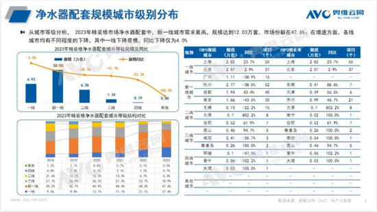從區(qū)域競(jìng)爭(zhēng)結(jié)構(gòu)來看,2023年精裝凈水器配套項(xiàng)目主要集中在華東區(qū),規(guī)模12.92萬(wàn)套,市場(chǎng)份額51.1%,此外華北區(qū)以4萬(wàn)套配套規(guī)模趕超華南區(qū),躋身前二,且以31.0%的規(guī)模增速趕超各大區(qū),其中北京以2.07萬(wàn)套配套規(guī)模持續(xù)位居華北區(qū)TOP1.市場(chǎng)份額超五成,其次是太原、石家莊,配套規(guī)模分別為0.70萬(wàn)套、0.51萬(wàn)套;從各城市級(jí)別來看,精裝凈水器市場(chǎng)主要集中在新一線、一線、二線城市,合計(jì)市場(chǎng)份額超九成,占比達(dá)93.9%,其中新一線城市需求最高,規(guī)模12.03萬(wàn)套,市場(chǎng)份額47.6%。單個(gè)城市來看,上海、杭州、北京位居前三城市,配套規(guī)模均在2萬(wàn)套以上。