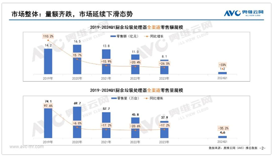 2024年第一季度廚余垃圾處理器整體市場規模延續下滑態勢,奧維云網(AVC)推總數據顯示,2024年一季度廚余垃圾處理器市場全渠道累計零售額1.2億元,同比下降33%;累計零售量為4.6萬臺,同比下降35.2%。降幅進一步擴大。