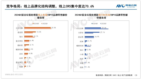 從品牌競爭來看,目前廚余垃圾處理器中以貝克巴斯、愛適易、唯斯特姆等為代表的垂直專業類品牌競爭優勢明顯,2024年一季度廚余垃圾處理器線上市場前5品牌零售額集中度達到70.6%,線下KA市場前5品牌零售額集中度達到82.6%。另外像卡薩帝等綜合類品牌在線下KA渠道增長也比較明顯。