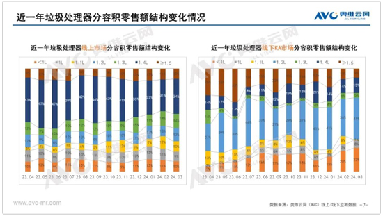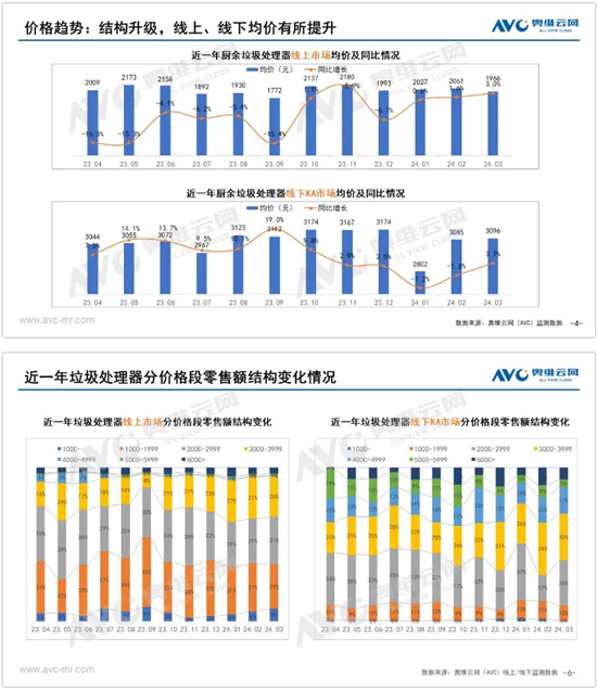 從價格趨勢來看,2024年3月廚余垃圾處理器市場均價有所提升,線上市場平均單價1966元,較同期增長3.0%。線下KA市場平均單價3096元,較同期增長3.7%。在從各價位段零售額結構占比來,線上與線下KA市場5000元以上高價位段產品受消費環境影響,均有所收窄。