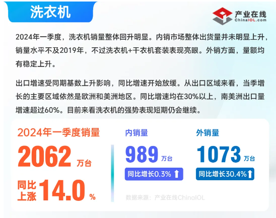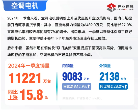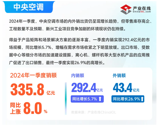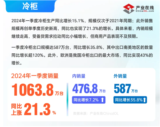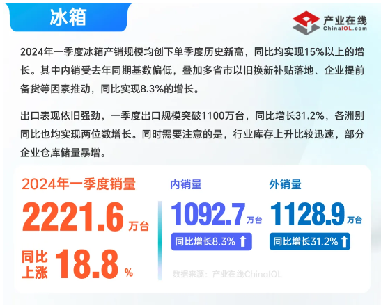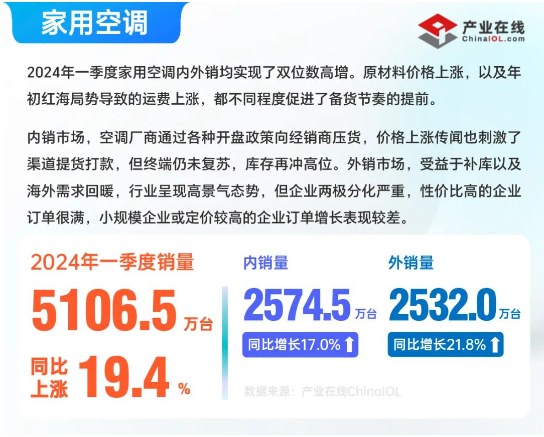產(chǎn)業(yè)在線發(fā)布的一季度全產(chǎn)業(yè)鏈數(shù)據(jù)顯示,大部分行業(yè)實(shí)現(xiàn)了首季開門紅,其中,冰空洗三大白電上下游產(chǎn)業(yè)鏈全線實(shí)現(xiàn)良好增長(zhǎng)。總體來看,一季度的內(nèi)外銷市場(chǎng)表現(xiàn)進(jìn)一步分化,不同行業(yè)走勢(shì)差異較大,制冷劑受配額政策影響,內(nèi)銷表現(xiàn)明顯好于出口。