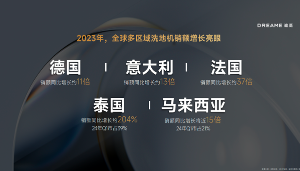 發布會上,追覓科技洗地機BG負責人胡臏表示,2023年,追覓科技洗地機產品全球銷量已超過140萬臺,同比增長超過100%。其中在歐洲市場、東南亞市場、北美市場,銷售額分別同比增長930%、420%、363%;而在泰國、馬來西亞等市場,不僅銷售額同比增長迅猛,至2024年Q1,市占率也已位列當地第一。
