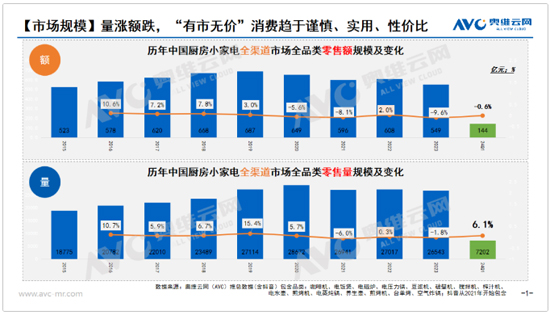 2024年一季度落下帷幕,小家電行業在“風雨飄搖”中表現出較強韌性,奧維云網(AVC)2024年一季度全渠道推總數據顯示,廚房小家電(包含品類:咖啡機、電飯煲、電磁爐、電壓力鍋、豆漿機、破壁機、攪拌機、榨汁機、電水壺、煎烤機、電蒸燉鍋、養生壺、煎烤機、臺式單功能小烤箱、空氣炸鍋)整體零售額144億元,同比下降0.6%;零售量7202萬臺,同比上漲6.1%;均價200元,同比下降6.3%。