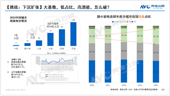 我們按照2023年中國城市級別劃分來看,288個城市,約10億的人口集聚在我國的三四五線。據相關公開數據展示城鎮消費品零售額70437億元,同比增長5.5%;鄉村消費品零售額10870億元,增長5.8%。故而大體量市場的消費能力的增強,會成為日漸需求提升的主要銷售渠道,此外據奧維云網(AVC)一季度線下監測數據中也能看到連續年度三、四級市場的份額也是在不斷提升的。從需求端來看,小鎮及農村市場的消費者的產品需求也一定有差異化,也需要品牌去做產品的差異化對標。