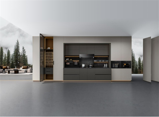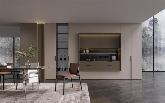 設(shè)計(jì)師圍繞空間功能、布局,運(yùn)用自然的石材、木飾面以及時(shí)尚的玻璃和金屬材料,以用心的細(xì)節(jié)、人體工程學(xué)的設(shè)計(jì)打造了一個(gè)人性化的廚房。不同材質(zhì)的碰撞,打破了空間的克制與拘謹(jǐn),愉悅感從這個(gè)自由流動的空間開始。有序的家居氛圍,離不開精細(xì)化的收納體系,廚房整體采用落地高柜設(shè)計(jì),充分增加了收納空間,也讓整體更顯簡約和大氣。烹飪區(qū)融入了智能化系統(tǒng),操作時(shí)更加便捷。酒柜的設(shè)計(jì),彰顯了品味與格調(diào),增添了空間的時(shí)尚氣息。