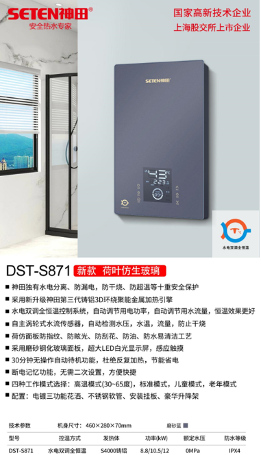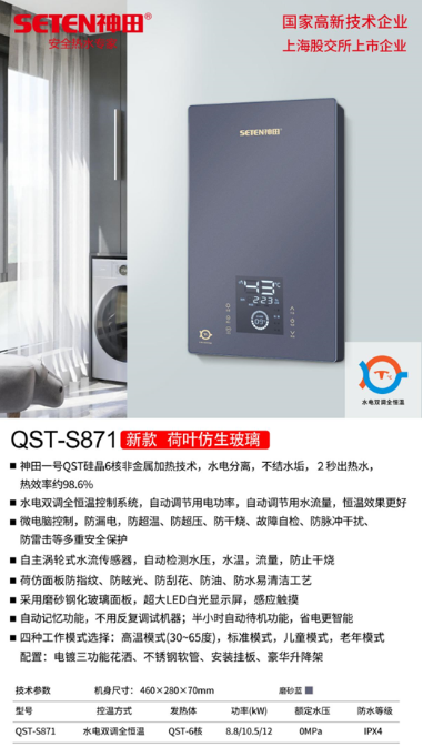 作為安全熱水專家,神田S871也配備了水電分離、防漏電、防干燒、防超溫、防超壓、故障自檢、防雷擊、防脈沖干擾等多種安全保護(hù)。自動(dòng)記憶功能,不用反復(fù)調(diào)試機(jī)器。半小時(shí)自動(dòng)待機(jī),省電更智能。