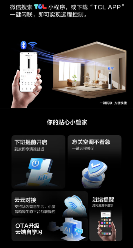 智能化不僅是一種技術的革新,更是一種生活方式的變革。TCL真省電Pro柜機支持手機遠程智控功能,可提前開啟空調,一回到家就享受清爽舒適的家居環境;還可以選擇微信搜索小程序進行一鍵閃聯,操作簡便快捷。